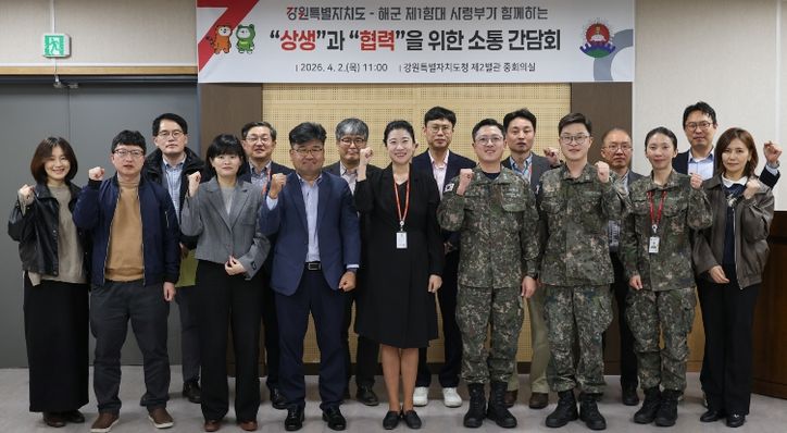 이날 간담회에는 강원특별자치도 및 해군 제1함대사령부 주요 관계자들이 참석한 가운데 ▲군 프로그램의 홍보를 통한 지역 참여 확대 ▲군 장병의 문화 체육 활동 참여를 통한 복지 증진 ▲지역대학과의 협력기반 마련을 통한 청년 유입 확대 ▲도 생활인구 활성화 방안 및 고향사랑기부금 정책 홍보 등을 논의하는 자리를 가졌다.