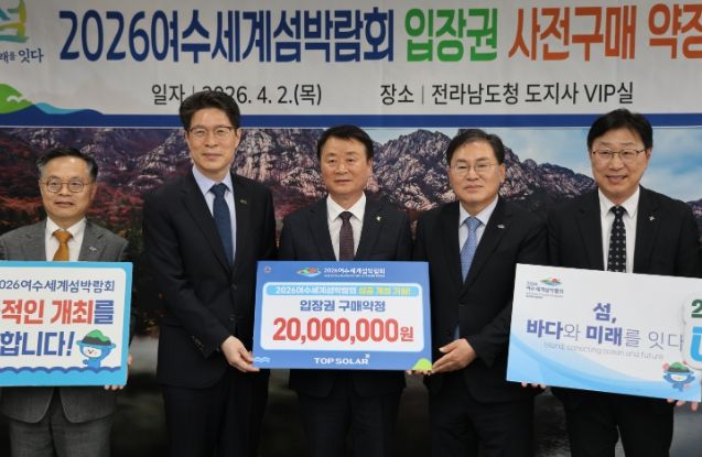 뉴한국방송뉴스통신사 신다은기자 기자 | (재)2026여수세계섬박람회조직위원회는 4월 2일 전남도청 VIP실에서 탑솔라㈜와 ‘2026여수세계섬박람회 입장권 구매약정식’을 개최했다고 밝혔다.