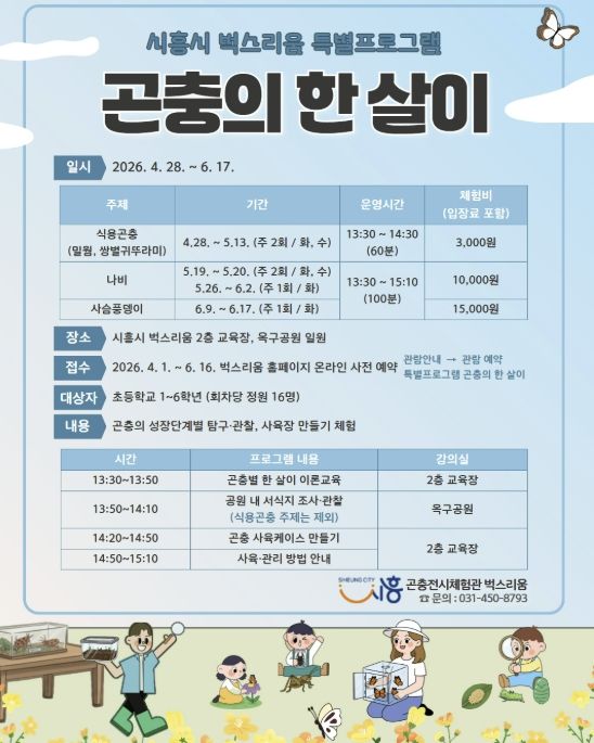 뉴한국방송뉴스통신사 신유철기자 기자 | 시흥시 곤충체험전시관 ‘벅스리움’은 오는 4월 28일부터 6월 17일까지 초등학생을 대상으로 특별프로그램 ‘곤충의 한 살이’를 운영한다.