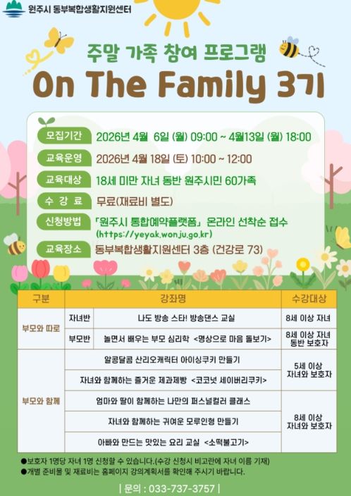 뉴한국방송뉴스통신사 양호선기자 기자 | 원주시 동부복합생활지원센터는 오는 18일, 주말 가족 참여 프로그램 ‘온 더 패밀리(On The Family)’ 3기 과정을 운영한다.