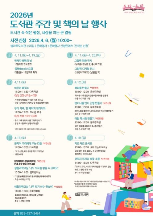 뉴한국방송뉴스통신사 양호선기자 기자 | 원주시 샘마루도서관은 ‘도서관 주간 및 책의 날’을 기념해 4월 11일부터 23일까지 작가 강연, 공연, 체험, 전시 등으로 구성된 다양한 문화 행사를 개최한다.