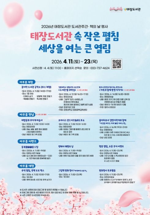 뉴한국방송뉴스통신사 양호선기자 기자 | 원주시 태장도서관은 도서관 주간 및 책의 날을 맞이해 오는 11일부터 23일까지 ‘태장도서관 속 작은 펼침, 세상을 여는 큰 열림’을 주제로 다양한 행사를 개최한다.