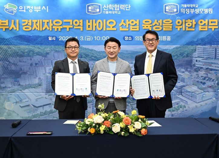 뉴한국방송뉴스통신사 신유철기자 기자 | 의정부시는 4월 3일 시청 회룡홀에서 가톨릭대학교 의정부성모병원, 가톨릭대학교 산학협력단과 함께 ‘의정부시 경제자유구역 바이오 산업 육성을 위한 업무협약’을 체결했다.