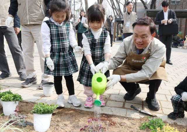 이날 행사에는 기부자와 주민, 어린이, 새마을지회, 강남정원사 등 500여 명이 참여해 산딸나무와 단풍나무 등 교목 94주, 영산홍과 사철나무 등 관목 1,000주를 심고, 초화류 정원과 벤치 등을 함께 조성했다.