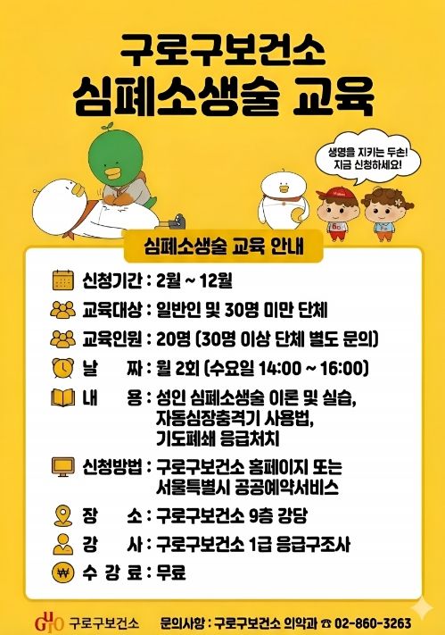 교육 신청은 구로구보건소 누리집 또는 서울특별시 공공예약서비스에서 가능하며, 교육비는 전액 무료다. 다만 신청 인원이 5명 미만일 경우 일정이 변경될 수 있다.