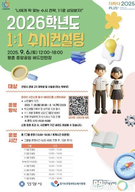 뉴한국방송뉴스통신사 신유철기자 기자 | 안양시가 주최하고 안양시 인재육성재단이 주관하는 ‘2026학년도 1:1 수시컨설팅’이 오는 9월 6일 12시 평촌중앙공원에서 개최된다.