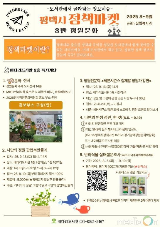 뉴한국방송뉴스통신사 신유철기자 기자 | 평택시 도서관은 정책마켓을 통해 평택시 주요 부서의 시정 홍보 및 정책 정보를 시민에게 친근하게 전달하고 있다. 이번 8월~9월에는 푸른도시사업소 산림녹지과와 협업하여 『2025 평택시 정책마켓 3탄 – 정원문화』에 관한 정보를 제공한다.