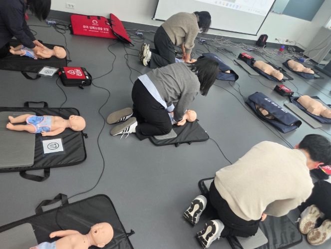 이번 교육은 '어린이 안전관리에 관한 법률'에 따라 어린이 이용시설(만 13세 미만 어린이가 주로 이용하는 시설) 종사자가 필수로 이수해야 하는 교육으로, 영아 및 소아 심폐소생술, 기도폐쇄 응급조치(하임리히법) 등 실습 교육으로 진행됐다.