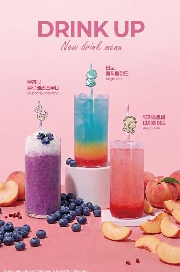 신규 음료는 상큼한 복숭아향을 느낄 수 있는 루카&토비 피치에이드, 진한 블루베리를 즐길 수 있는 브리나 블루베리스무디, 신비로운 색감의 티노 매직에이드 총 3가지이다. 3가지 음료는 오는 4월 18일부터 당항포관광지에서 구매하여 만나볼 수 있다.