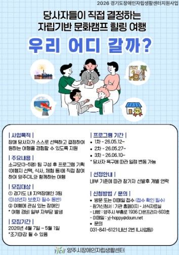 뉴한국방송뉴스통신사 신유철기자 기자 | 양주시장애인자립생활센터에서는 장애인 당사자가 직접 선택하고 결정하는 자립 기반 힐링 여행을 목적으로 하는 지역 장애인 문화캠프 [우리 어디 갈까?] 참가자를 모집한다.