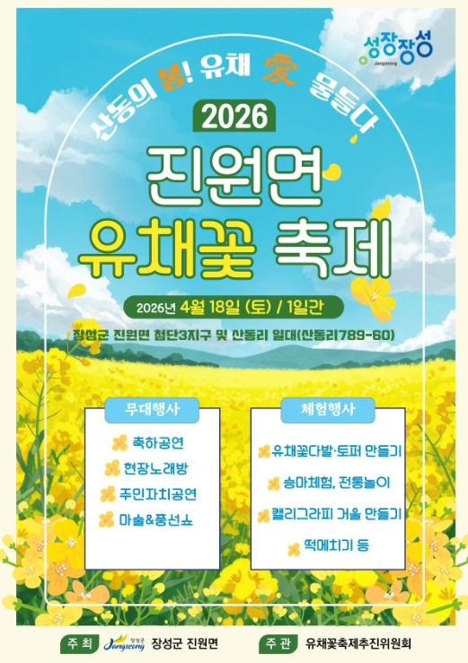 뉴한국방송뉴스통신사 신다은기자 기자 | 장성군 진원면 유채꽃 축제가 오는 18일 산동리에서 열린다.