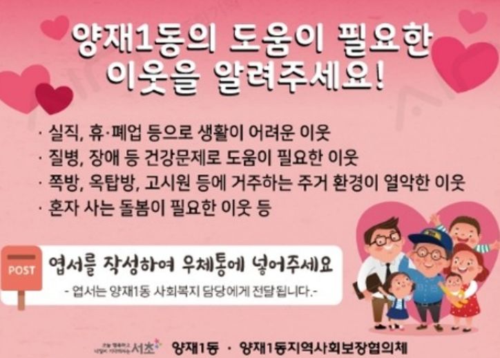 양재1동에서 올해 처음 시행하는 희망우체통 ‘함께함’은 동네 주민이라면 누구나 자유롭게 이용할 수 있는 참여형 복지 제도다. 주민들의 눈으로 일상 속 이웃들을 살피고 도움이 필요한 위기가구를 발견해 신속한 지원으로 이어지도록 하는 역할을 한다.