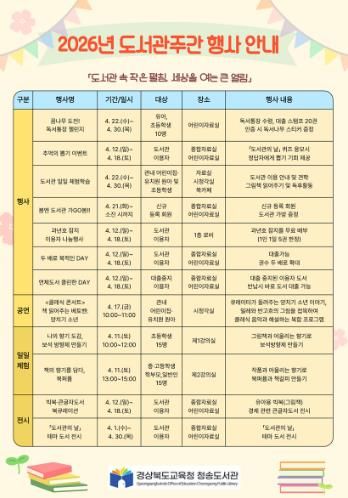 뉴한국방송뉴스통신사 신유철기자 기자 | 경상북도교육청 청송도서관이 2026년 4월 도서관주간을 맞이하여 ‘도서관 속 작은 펼침, 세상을 여는 큰 열림’을 주제로 다양한 독서·문화 프로그램을 운영한다.