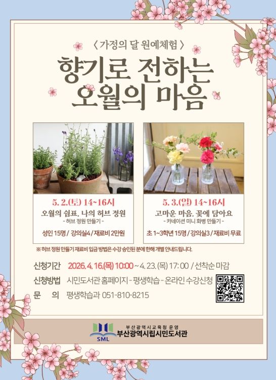 뉴한국방송뉴스통신사 신유철기자 기자 | 부산광역시립시민도서관은 오는 5월 2일과 3일 시민도서관 강의실에서 성인과 초등학생 30명을 대상으로 가정의 달 원예체험 ‘향기로 전하는 오월의 마음’을 운영한다.