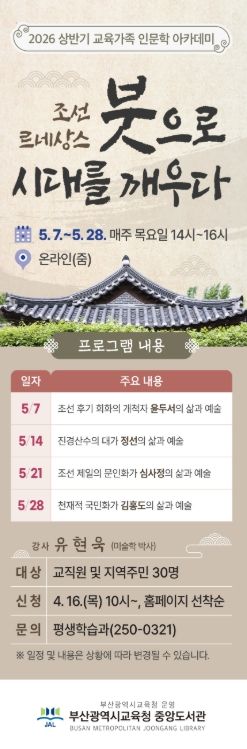 뉴한국방송뉴스통신사 신유철기자 기자 | 부산광역시립중앙도서관은 오는 5월 7일부터 28일까지 매주 목요일마다 4회에 걸쳐 교직원 및 지역주민 30명을 대상으로 온라인(ZOOM)을 통해 인문학 아카데미 ‘조선 르네상스, 붓으로 시대를 깨우다’를 운영한다.