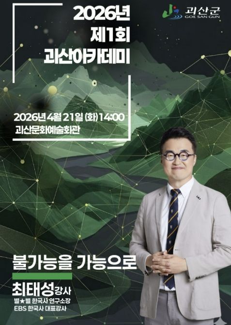 뉴한국방송뉴스통신사 권영분기자 기자 | 충북 괴산군은 군민의 문화의식 함양과 평생학습 진흥을 위해 오는 21일 오후 2시에 괴산문화예술회관에서 2026년 제1회 괴산아카데미를 개최한다고 밝혔다.