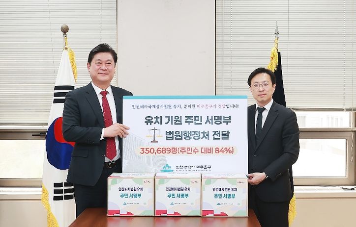 이영훈 구청장은 “미추홀구는 사법 행정 효율성과 접근성, 그리고 즉시 착공 가능한 부지까지 모두 갖춘 해사법원 유치의 정답지”라며 “35만 주민의 간절한 목소리가 전달된 만큼, 법원행정처에서도 미추홀구의 준비된 역량을 긍정적으로 검토해 줄 것으로 기대한다”라고 밝혔다.