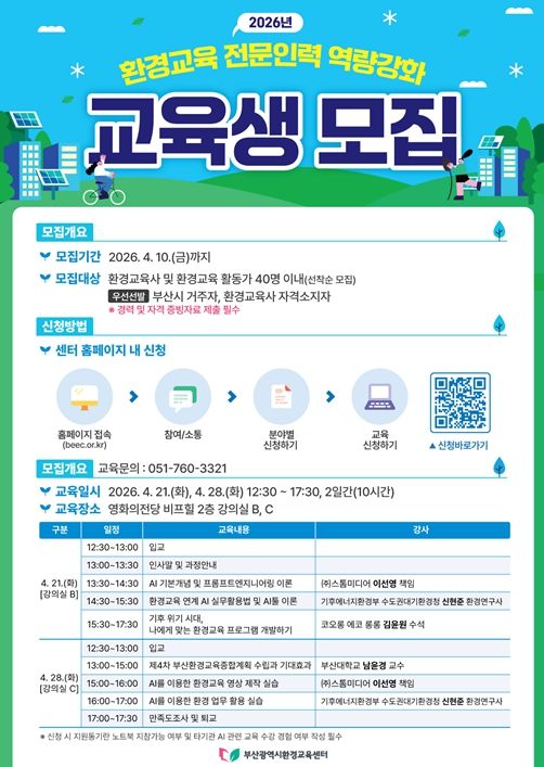 뉴한국방송뉴스통신사 신유철기자 기자 | 부산시는 변화하는 환경정책과 교육 수요에 대응하고 지역 환경교육 전문인력의 역량 강화를 위해 오는 4월 21일과 28일 이틀간 해운대구 영화의전당에서 '2026년 환경교육 전문인력 역량강화 교육'을 실시한다고 밝혔다.