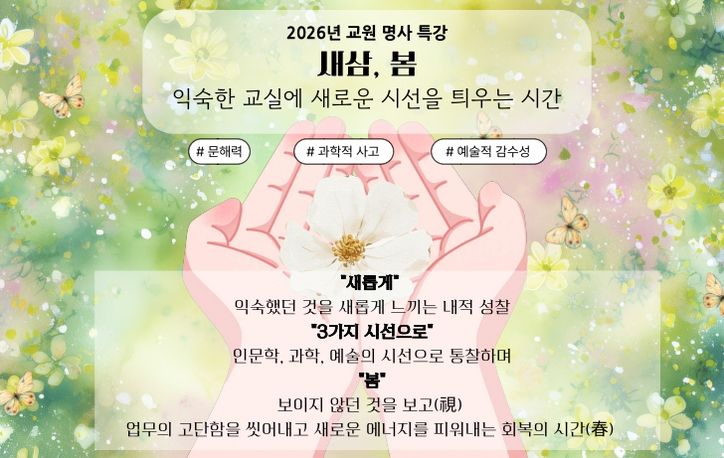 뉴한국방송뉴스통신사 신유철기자 기자 | 부산광역시교육청교육연수원은 오는 21일부터 6월 2일까지 3회에 걸쳐 연수원 대강당에서 교원 및 교육전문직원 400여 명을 대상으로 2026 명사 초청 특강 ‘새삼 봄’을 운영한다.