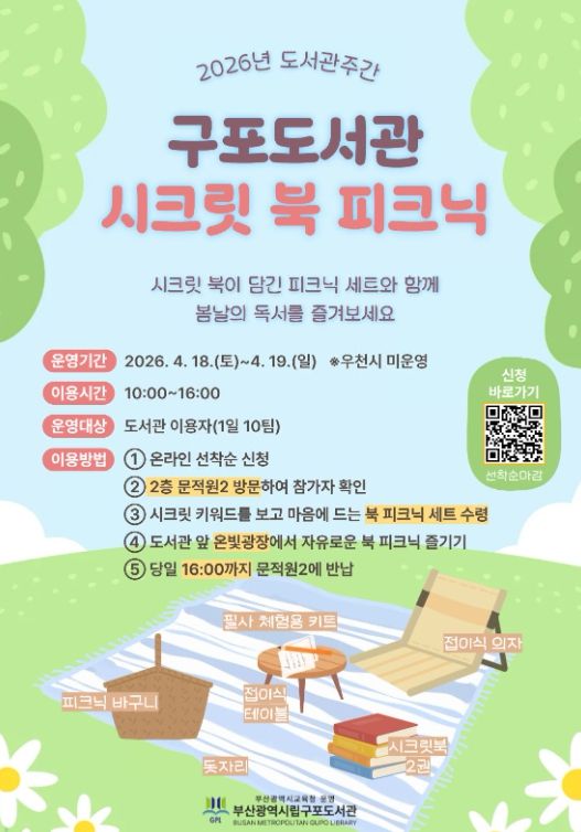 뉴한국방송뉴스통신사 신유철기자 기자 | 부산광역시립구포도서관은 도서관 주간을 맞아 오는 18일과 19일 이틀간 도서관 앞 온빛광장에서 도서관 이용자를 대상으로 이색 대출 서비스 ‘시크릿 북 피크닉’을 운영한다.