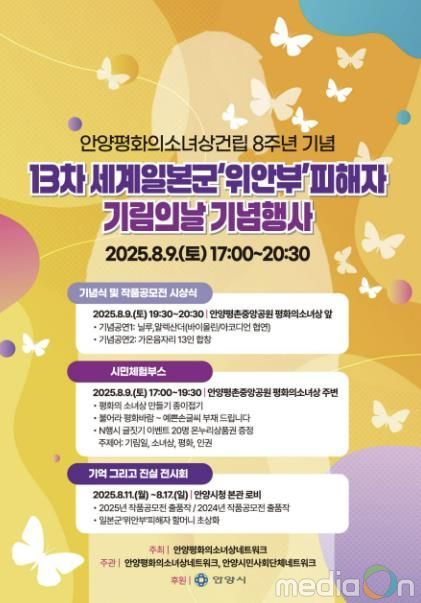 뉴한국방송뉴스통신사 신유철기자 기자 | 안양시는 오는 9일 오후 7시 30분 평촌중앙공원의 안양 평화의소녀상 앞에서 일본군 ‘위안부’피해자 기림의 날(8. 14.) 행사가 열린다고 8일 밝혔다.