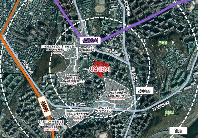 대상지는 5호선 신금호역 역세권에 위치하고 있어 광화문, 종로 등 강북 도심권(CBD)과 여의도(YBD)로의 접근성이 좋으며, 응봉근린공원, 대현산 배수지 공원 등 다수 공원이 인접하고 있어 녹지공간이 풍부하며, 왕십리 지역과도 근접해 있어 역세권 중심의 직주근접 도시 형성에도 크게 기여할 것으로 예상된다.