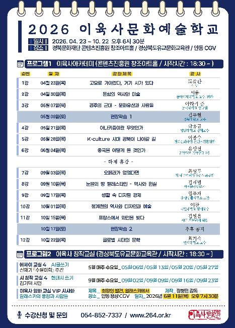 뉴한국방송뉴스통신사 신유철기자 기자 | 안동시 이육사문학관은 4월 23일부터 '2026 이육사문화예술학교'를 개강한다. '2026 이육사문화예술학교'는 국내외 저명 강사들이 참여해 인문․예술 전반의 다양한 주제를 다루며, 시민이 일상에서 인문학의 깊이를 체감할 수 있도록 풍성하고 내실 있는 강연으로 운영된다.