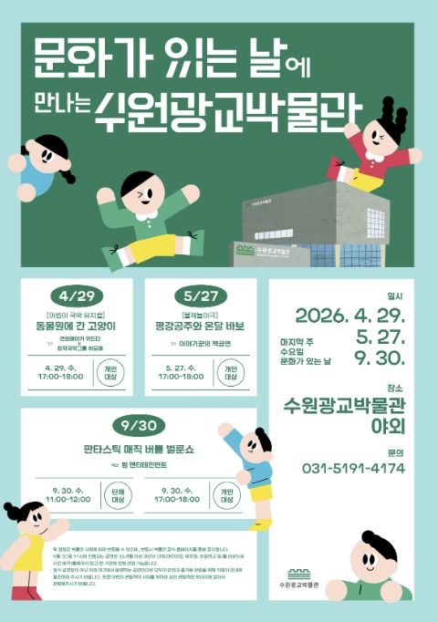 뉴한국방송뉴스통신사 신유철기자 기자 | 수원광교박물관은 4·5·9월 ‘문화가 있는 날’(매달 마지막 주 수요일)에 박물관 야외에서 어린이와 가족 관람객을 위한 무료 공연을 연다.