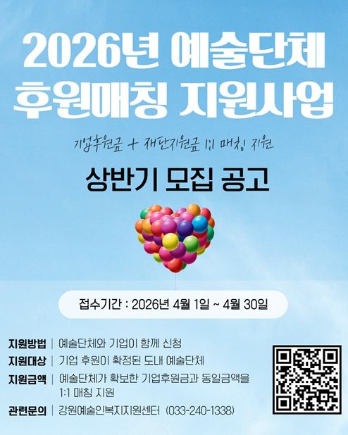 뉴한국방송뉴스통신사 신유철기자 기자 | 강원문화재단은 도내 예술단체의 안정적인 창작기반 마련과 기업의 문화예술 후원 참여 확대를 위해 '2026년 예술단체 후원매칭 지원사업' 상반기 공모를 추진한다.