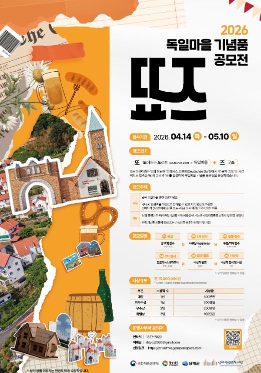 뉴한국방송뉴스통신사 신유철기자 기자 | 남해군관광문화재단이 ‘2026 독일마을 기념품 공모전, 뚀즈’를 개최하기로 하고, 4월 14일부터 5월 10일 18시까지 참가 접수를 진행한다고 밝혔다.