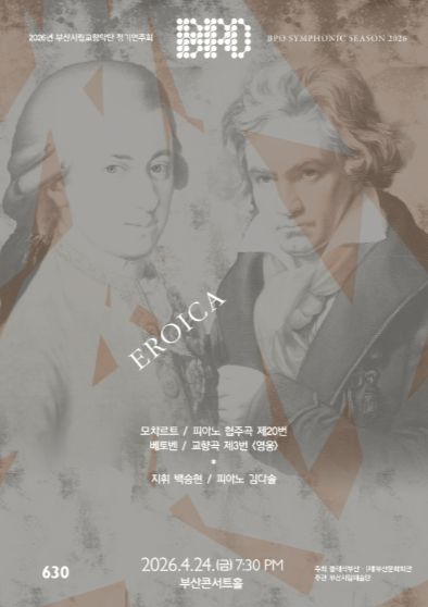 뉴한국방송뉴스통신사 신유철기자 기자 | 부산시립교향악단이 오는 4월 24일 오후 7시 30분, 부산콘서트홀에서 제630회 정기연주회 '에로이카(EROICA)'를 개최한다. 이번 공연은 고전주의의 균형에서 출발해 낭만주의의 확장으로 나아가는 흐름 속에서, 불안과 긴장을 넘어서는 인간의 의지를 조명하는 무대로 마련된다.