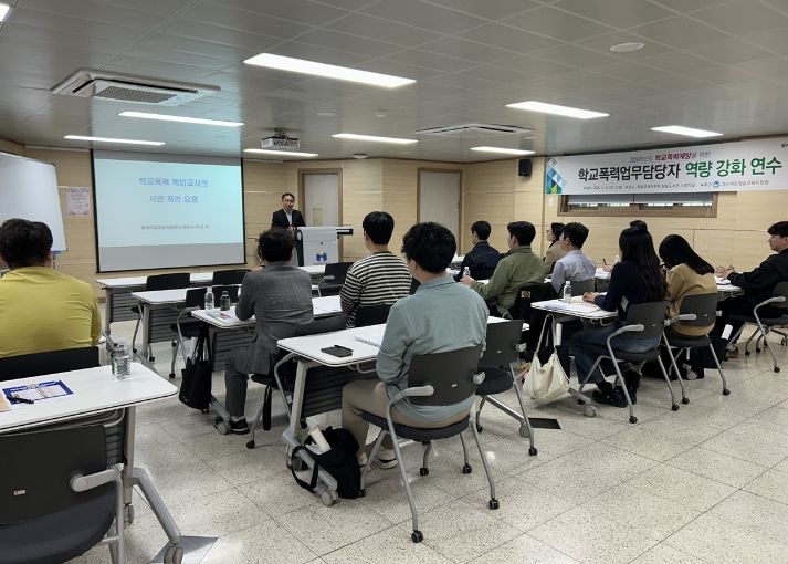이번 연수는 박준석 변호사를 강사로 초빙하여 학교폭력 책임교사들의 학교폭력 예방 방법 및 학교폭력 발생 시 사안 처리 주의점을 확인하고 효과적인 대응 방안을 공유하는 데 초점을 맞추었다. 연수에 참석한 교사들은 사안 조사의 구체적 방법과 유의점, 관련 학생 및 학부모와의 상담 방법, 관계 회복에 관한 내용을 주의 깊게 듣고 서로 의견을 나누는 활동을 통하여 학생, 교사, 학부모 모두가 만족하고 안전한 학교를 만들어가야겠다고 다짐했다.