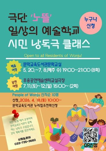 뉴한국방송뉴스통신사 신유철기자 기자 | 문막교육도서관은 5월 20일부터 7월 8일까지 매주 수요일 저녁, 지역 극단 ‘노뜰’의 전문 배우들과 협력해 시민들의 일상을 예술로 물들이는 특별한 예술학교를 운영한다.