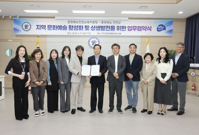뉴한국방송뉴스통신사 권영분기자 기자 | 충북 진천군과 진천교육지원청은 17일 진천교육지원청 온누리홀에서 ‘지역 문화예술 활성화와 상생발전’을 위한 업무협약을 체결했다고 밝혔다.