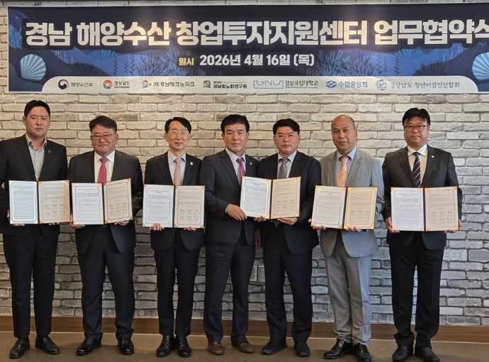 뉴한국방송뉴스통신사 신유철기자 기자 | 경상국립대학교 해양과학대학은 경상남도 해양수산 창업투자 활성화를 위해 4월 16일 경남테크노파그에서 경상남도, 경남테크노파크, 경남항노화연구원, 수협중앙회 경남본부, 경상남도 청년어업인연합회 등과 업무협약(MOU)을 체결했다.