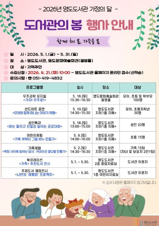 영도도서관 관계자는 “‘도서관의 봄’ 행사를 통해 도서관이 지역 주민들에게 따뜻한 위로와 행복을 전하는 문화 휴식 공간이 되길 바란다”며, “앞으로도 가족이 함께 책으로 소통하고 성장할 수 있는 기회를 지속적으로 마련하겠다”고 말했다.
