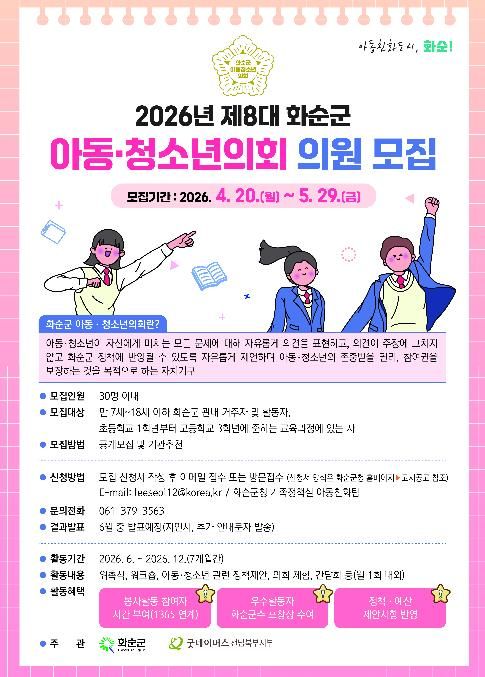 뉴한국방송뉴스통신사 신다은기자 기자 | 화순군은 ‘2026년 제8대 화순군 아동·청소년의회’ 의원 30명을 오는 4월 20일부터 5월 29일까지 공개 모집한다고 밝혔다.