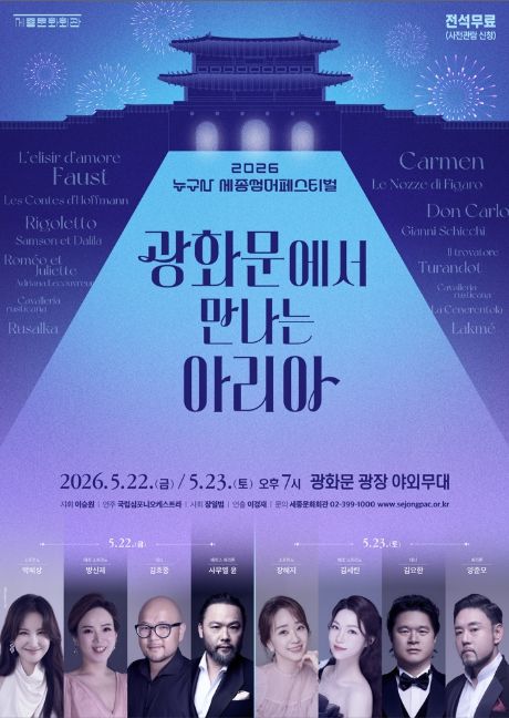 뉴한국방송뉴스통신사 신유철기자 기자 | 세종문화회관은 서울시민 누구나 즐길 수 있는 세종 썸머 페스티벌 '광화문에서 만나는 아리아'를 오는 5월 22일과 23일, 양일간 광화문 광장에서 개최한다. 광화문 광장은 시민 중심의 공간으로 새롭게 거듭난 이후 서울을 대표하는 문화 명소로 자리해 왔으며, 그 중심에서 세종문화회관은 한국 문화예술을 상징하는 공간으로 자리해 왔다. 이러한 공간적 맥락 속에서 세종문화회관과 광화문 광장은 문화의 전통성과 동시대성을 함께 품은 열린 문화예술 플랫폼으로 그 의미를 확장해가고 있다.