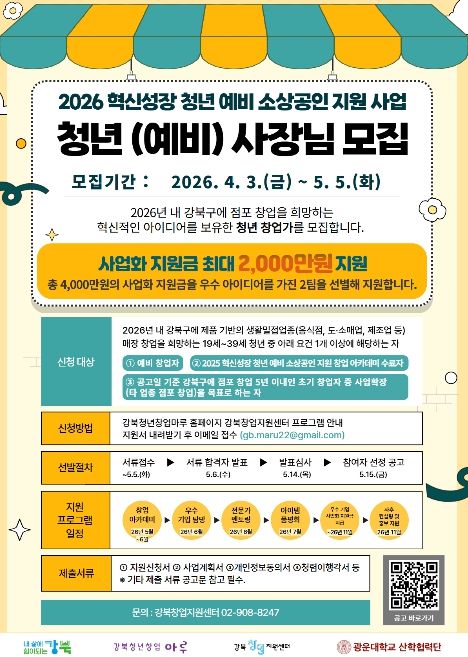 모집 대상은 2026년 내 강북구에 점포 창업을 희망하는 19세 이상 39세 이하 청년으로, 예비창업자 및 5년 이내의 초기 창업자를 포함한다. 이 중 초기 창업자는 분점이 아닌 독립 점포 형태로 생활밀접업종 분야의 신규 창업을 계획하고, 1인 이상 고용 창출이 가능한 경우 신청할 수 있다.