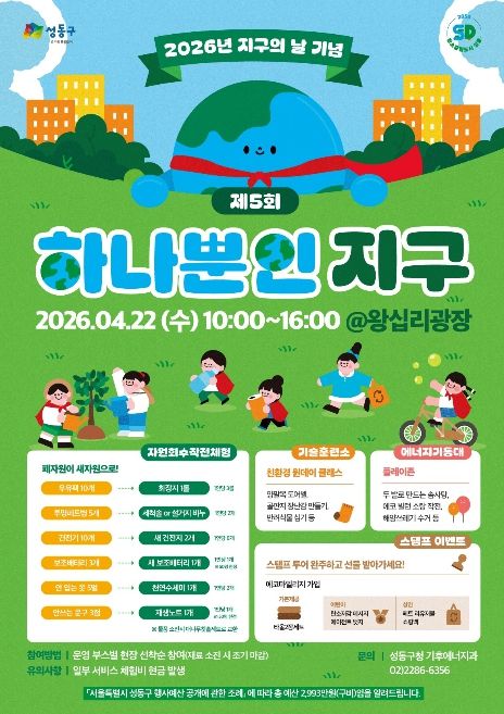 뉴한국방송뉴스통신사 신유철기자 기자 | 서울 성동구는 오는 4월 22일 왕십리광장에서 기후위기의 심각성을 알리고 탄소중립 실천 문화를 확산하기 위한 ‘제5회 하나뿐인 지구’ 행사를 개최한다고 밝혔다.