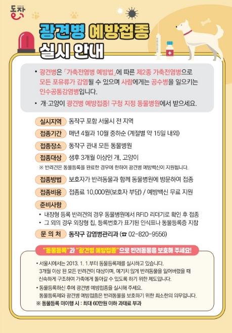 뉴한국방송뉴스통신사 신유철기자 기자 | 동작구가 반려동물과 주민의 안전을 위해 봄철 광견병 예방접종을 실시한다고 밝혔다.