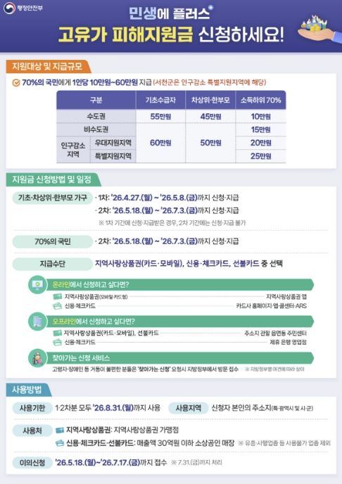 구체적인 지원 금액은 ▲기초생활수급자 60만원 ▲차상위계층 및 한부모가족 55만원 ▲소득 하위 70% 일반 군민 25만원이다.
