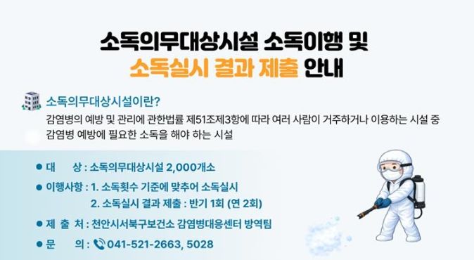 관내 소독의무대상시설은 2,000여 개소로, △숙박업소(객실 수 20실 이상) 및 관광숙박업소 △식품접객업소(연면적 300㎡ 이상) △버스 및 장의자동차 △대형마트 및 전통시장 △집단급식소 △공동주택(300세대 이상) △학교 등이다.