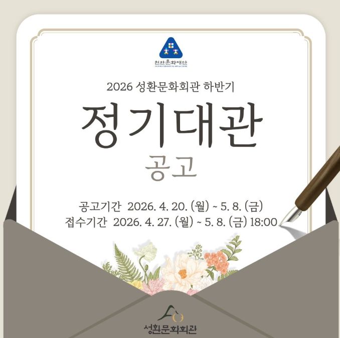 신청은 성환문화회관 누리집에서 가능하며, 선정 결과는 내달 15일 확인할 수 있다.