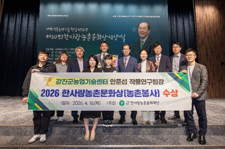 뉴한국방송뉴스통신사 신다은기자 기자 | 강진군은 한사랑농촌문화재단이 주관하는 ‘한사랑농촌문화상’ 농촌봉사 부문에서 강진군 농업기술센터 안준섭 작물연구팀장이 수상의 영예를 안았다고 20일 밝혔다.
