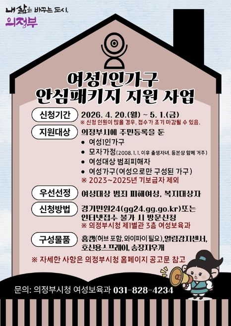 뉴한국방송뉴스통신사 신유철기자 기자 | 의정부시는 4월 20일부터 5월 1일까지 12일간 온․오프라인을 통해 여성 1인 가구 안심패키지 지원사업의 신청을 접수한다.