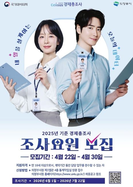 뉴한국방송뉴스통신사 신유철기자 기자 | 의정부시는 6월 1일부터 실시되는 ‘2025년 기준 경제총조사’의 원활한 추진을 위해 조사요원 77명을 모집한다.