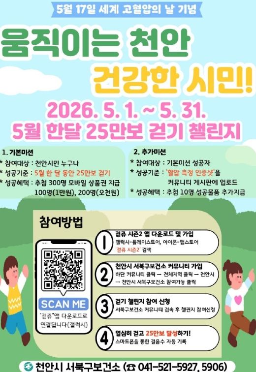 이현기 서북구보건소장은 “걷기는 누구나 일상에서 쉽게 실천할 수 있는 대표적인 신체활동”이라며 “이번 챌린지를 통해 규칙적인 걷기습관을 형성하고, 심뇌혈관질환 예방의 중요성에 대한 인식이 높아지길 바란다”고 말했다.