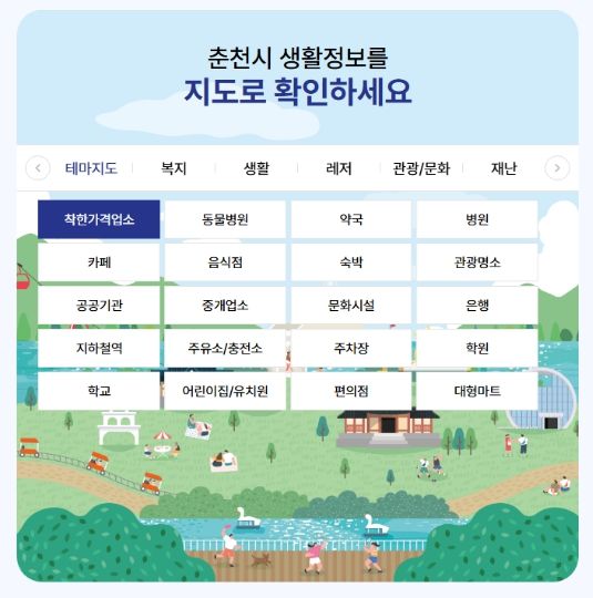 춘천시 생활안내지도는 시민 생활에 도움이 될 수 있는 5개 분야(복지, 생활, 레저, 관광·문화, 재난)의 총 23종의 주제를 제공, 지난 2022년부터 다양한 행정정보를 지도 형태로 제공하는 플랫폼이다. 춘천시청 홈페이지 퀵메뉴 서비스를 통해 PC나 스마트폰으로 누구나 들어갈 수 있다. 인터넷에서 ‘춘천시 생활안내지도'를 검색하거나 춘천시청 홈페이지 퀵메뉴 서비스를 통해 PC나 스마트폰으로 누구나 들어갈 수 있다.
