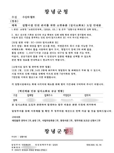 뉴한국방송뉴스통신사 신유철기자 기자 | 창녕군은 공무원을 사칭해 관내 장례식장에 소방용품(질식소화포) 구매를 요구하는 보이스피싱 사례가 발생했다고 밝혔다.